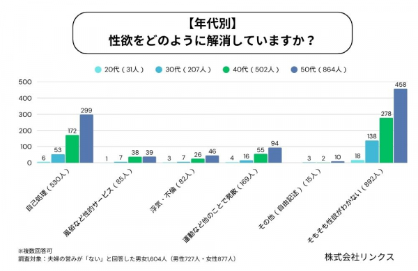 年代別では、30代で「性欲がわかない」と答えた割合が約67%と最多。50代は約53%と低めで、風俗利用よりも「浮気・不倫」が上回るという特徴も見られました。