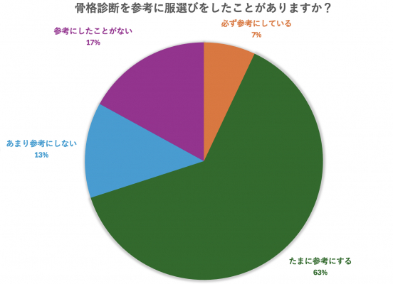 今回のアンケートでは、多くの方が骨格診断を服選びの参考にしており、情報源としてSNSが大きな割合を占めることが分かりました。これにより、骨格診断は単なる流行に留まらず、日常の服選びの基準として広く浸透していることがうかがえます。