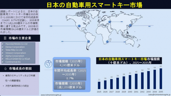 調査レポートによると、日本の自動車用スマートキー市場は2025年から2035年にかけて年平均成長率(CAGR)8.7%を記録し、2035年末までに1兆1,059億米ドルの市場規模に達する見込みです。2025年の市場規模は4,245億米ドルと評価されました。