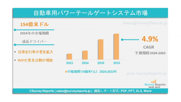 Surveyreportsの専門家は、自動車用電動式テールゲートシステム市場の調査を分析し、2024年の自動車用電動式テールゲートシステム市場規模は154億米ドルに達すると予測した。さらに、自動車用パワータイゲートシステム市場のシェアは、2033年末までに238億米ドルに達すると予測されている。自動車用パワータイゲートシステム市場は、2024年から2033年の予測期間にわたって、年間平均成長率(CAGR)約4.9%で成長すると予測されている。