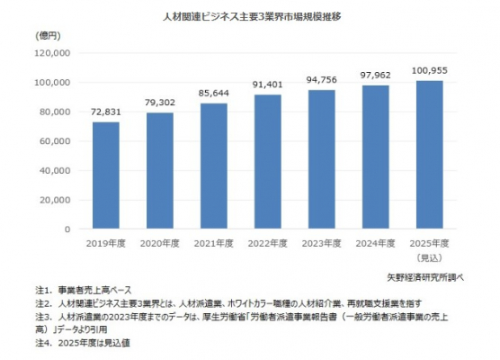 2025年度の人材関連ビジネス主要3業界(人材派遣業、ホワイトカラー職種の人材紹介業、再就職支援業)の市場規模は、事業者売上高ベースで前年度比3.1%増の10兆955億円の見込みである。2025年度は継続する人手不足を背景に、人材派遣業とホワイトカラー職種の人材紹介業の成長が市場を牽引する形となり、10兆円を上回ると見込む。