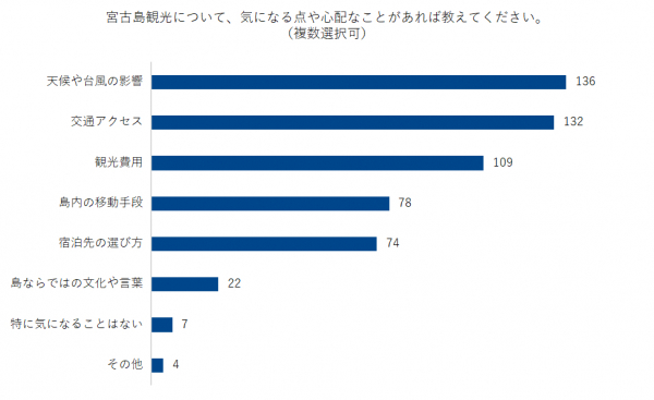 「天候や台風の影響」136人、「交通アクセス」132人、「観光費用」109人、「島内の移動手段」78人、「宿泊先の選び方」74人、「島ならではの文化や言葉」22人、「特に気になることはない」7人、「その他」4人でした。