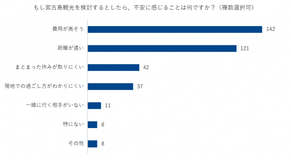 宮古島観光を検討する際、不安に感じることをたずねたところ、最も多かったのは「費用が高そう」で142人でした。次いで、「距離が遠い」121人、「まとまった休みが取りにくい」42人、「現地での過ごし方がわかりにくい」37人、「一緒に行く相手がいない」11人と続きます。