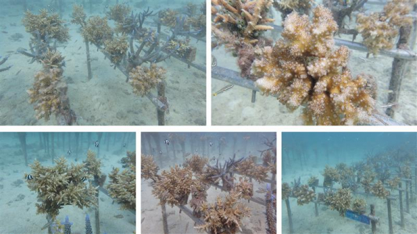 この活動の初期段階では、小さなサンゴが海底に並ぶ姿でしたが、
