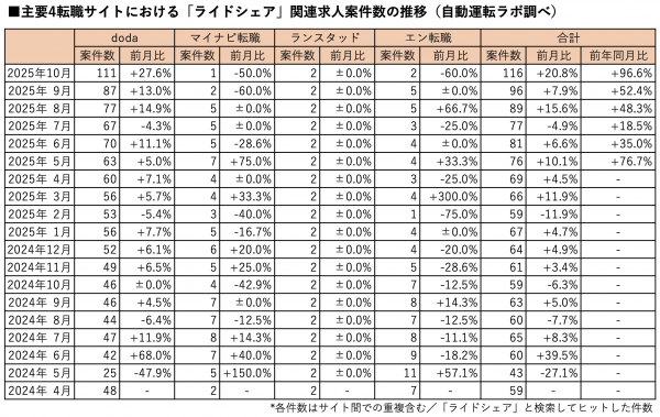 主要転職4サイトにおけるライドシェアの関連求人案件数(※「ライドシェア」と検索してヒットした求人)は2025年10月末時点で前月比20.8%増、前年同月比96.6%増の116件となりました。