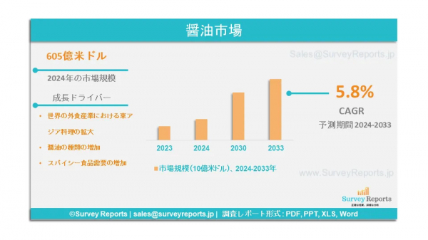 Surveyreportsの専門家は、醤油市場調査を分析し、2024年に生成された醤油市場規模が605億米ドルであることを発見した。さらに、醤油市場のシェアは、2033年末までに1015億米ドルに触れる収益を予見する。醤油市場は、2024年と2033年の予測期間中に約5.8%のCAGRで成長することが提案されている。