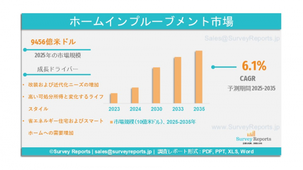 サーベイレポーツの専門家によると、住宅改善市場の調査結果から、2025年における市場規模は9,456億米ドルであった。また、2035年末までに市場シェアは1兆7,658億米ドルに達すると予測されている。予測期間(2025年~2035年)における住宅改善市場の年平均成長率(CAGR)は約6.1%6.1\%6.1%で成長すると見込まれている。