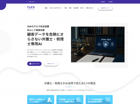株式会社APOLLO11(本社:愛知県名古屋市昭和区、代表取締役:吉丸彰)は、法律・税務の専門家向けに開発したAIプラットフォーム「NuraGrid Legal & Tax」の提供を開始いたしました。ZDR(Zero-Data-Retention)モデルを採用し、顧客データをサーバーに一切保存しない画期的な仕組みにより、守秘義務を完全遵守しながら業務効率を飛躍的に向上させることができます。