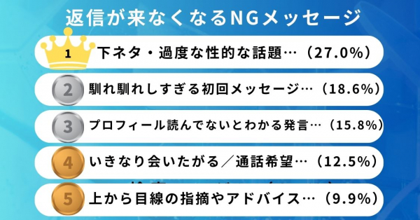 マッチング後のメッセージにおいて、「相手に安心感を与える」「適度な距離感を保つ」ことは非常に重要です。 今回の調査では、男性側が“良かれと思って送った一言”が、女性にとっては「急すぎる」「不快」と捉えられ、返信が止まるきっかけになっていることが明らかになりました。 アプリ上のやりとりでは、まず相手のプロフィールを丁寧に読み、自然な流れで会話を続けることが大切です。