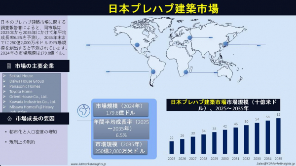 日本のプレハブ建築市場に関する 調査報告書によると、同市場は2025年から2035年にかけて年平均成長率6.5%を予測し、2035年末までに250億2,000万米ド ルの市場規模を創出すると予測されています。2024年の市場規模は179.8億ドル。
