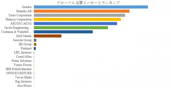 LP Informationのトップ企業研究センターによると、オフィス改装サービスの世界的な主要製造業者には、Gensler、Skanska AB、Taisei Corporation、Shimizu Corporation、AECOM (ACM)、Jacobs Engineering Group、Cushman & Wakefield (CWK) 、Gold Mantis、Saracen Group、IBI Groupなどが含まれている。2024年、世界のトップ5企業は売上の観点から約4.0%の市場シェアを持っていた。