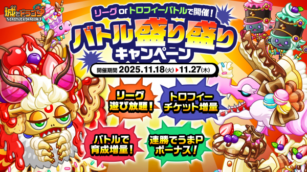 対象期間中の「リーグ」と「トロフィーバトル」で、「リーグ遊び放題」や「連勝でうまPボーナス」、「トロフィーチケット増量」、「バトルで育成増量」といった、クラスやキャラLvを上げやすくなるキャンペーンを開催中です。