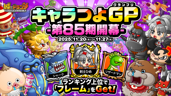 「キャラつよグランプリ」とは、対象キャラをリーダーにして戦い、強さを表すポイントとなる“キャラつよP”を競うイベントです。対象となるバトルは開催期間中の「ひとりでリーグ」(ゴールドクラス以上)となり、イベント終了時のランキングに応じて、上位者にはキャラアイコンを装飾できる“フレーム”が贈られます。