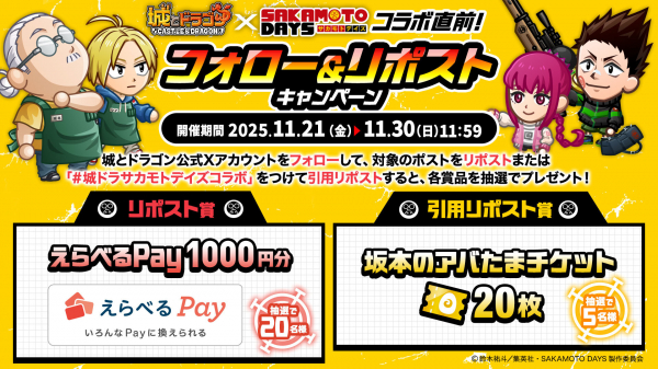 コラボ開催を記念して、「コラボ直前!フォロー&リポストキャンペーン」を実施いたします。『城とドラゴン』公式Xアカウント(@shirotodoragon)をフォローし、キャンペーン対象ポストをリポスト、またはハッシュタグ「#城ドラサカモトデイズコラボ」をつけて引用リポストされた方の中から抽選で各賞品をプレゼント!ぜひ引用リポストする際はハッシュタグとあわせて、「コラボイベントが発表された時の感想」や「コラボイベントの楽しみにしているポイント」などもコメントしてみてください!
