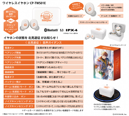 本コラボレーションモデルは、北見遊征をイメージしたデザインを左右のイヤホンや充電ケースにあしらい、白を基調としたシンプルで普段使いができるデザインです。また内蔵されているボイスは完全録り下ろし(全13ワード)です。パッケージには、本コラボレーションモデルのために撮り下ろされた北見遊征のビジュアルを採用しています。
