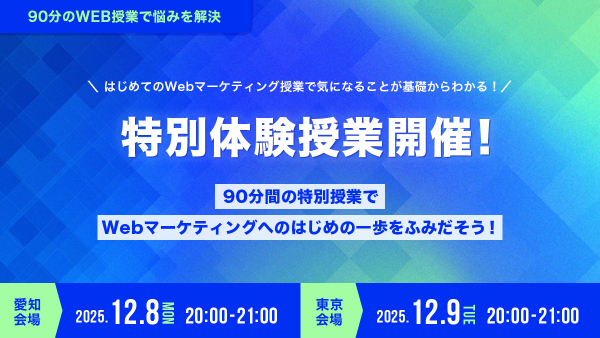 本授業は、これまでオンラインで延べ15,000名以上が参加した「無料特別授業」の対面版として実施されるもので、Webマーケティングの基礎から実務へのステップを、90分で習得できる内容となっています。