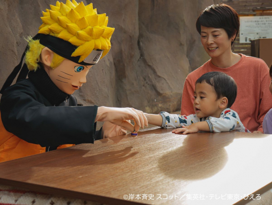 「ナルトと独楽回し対決」では、日本古来のおもちゃである“独楽”を用いて、どちらがより長く独楽を回することができるかをうナルトと対決いただき、勝利した方には、ニジゲンノモリオリジナルステッカーをプレゼントいたします。「ナルトとこたつポカポカフォト」では、「NARUTO&BORUTO 忍里」に登場した“こたつ”に、ナルトと一緒に入って“ポカポカ”温かな記念撮影をお楽しみいただけます。