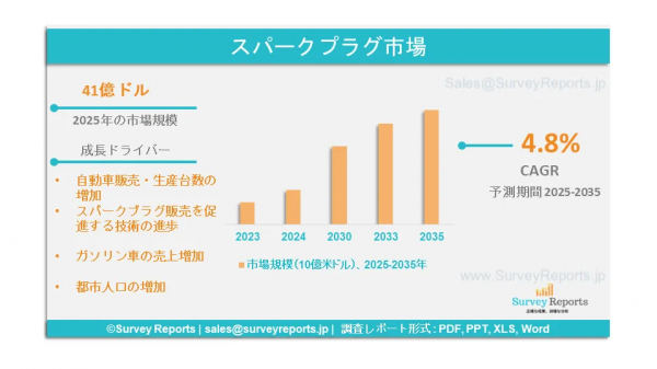 Surveyreportsの専門家による市場調査によれば、2025年におけるスパークプラグ市場の規模は41億米ドルであった。また、2035年末には69億米ドルに達すると予測されている。予測期間である2025年から2035年にかけて、スパークプラグ市場は年平均成長率(CAGR)約4.8%で拡大する見込みである。