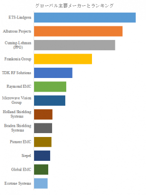 EMCチャンバー市場は、高度な設計技術と施工ノウハウを要するため、参入障壁が高く、グローバルでは寡占的な構造を形成している。市場の上位を占めるのはETS-Lindgren、Albatross Projects、Cuming-Lehman(PPG)、Frankonia Group、TDK RF Solutions、Raymond EMCなどの欧米および日本勢である。これらの企業は、材料工学・電磁解析・施工精度の三位一体による総合的ソリューション提供力で強固な地位を確立している。