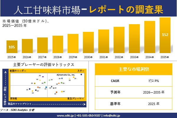 人工甘味料市場に関する弊社の調査レポートによると、人工甘味料 市場規模は 2035 年に約 152億米ドルに達すると予想されています。さらに、2025 年の 人工甘味料市場規模は約 105億米ドルとなっています。人工甘味料に関する市場調査レポートでは、市場は 2026-2035 年の予測期間中に約 2.9% の CAGR で成長するとも述べられています。
