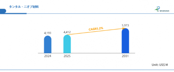 LP Information調査チームの最新レポート「世界タンタル・ニオブ材料市場の成長予測2025~2031」(https://www.lpinformation.jp/reports/435812/tantalum-and-niobium-materials)によると、2025年から2031年の予測期間中のCAGRが5.2%で、2031年までにグローバルタンタル・ニオブ材料市場規模は59.73億米ドルに達すると予測されている。この市場予測は、タンタル・ニオブ材料が特定の産業の景気変動に左右されることなく、複数の高成長分野の技術革新に支えられていることを示している。特に、5G通信の普及やIoTデバイスの増加が、川上素材であるタンタル・ニオブ材料への需要をさらに押し上げる要因となっている。