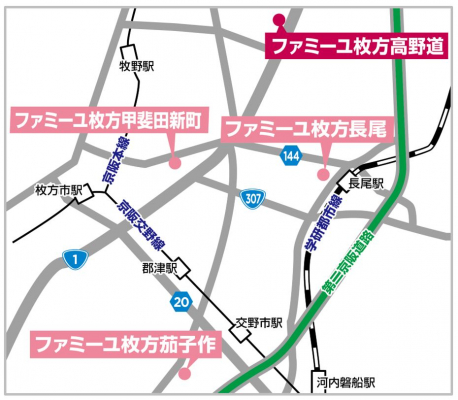 (地図)枚方市内のファミーユホールは4店舗の展開となる