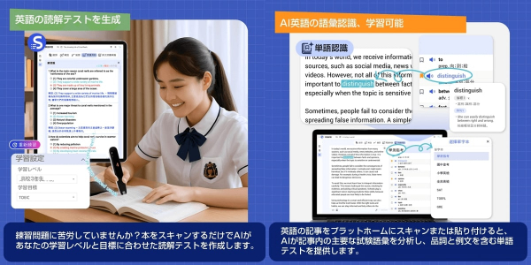 「WorldPenScan Ai Reader」は、紙の資料や本の文字をなぞってテキストデータ化できるOCR機能を搭載し、長文の日本語や英語などの文字入力を効率化できるほか、オフラインでも12言語の翻訳・読み上げが可能でオンライン接続時には60言語対応やAIプラットフォーム連携のWEBアプリ「ScanNoto」(翻訳/テキスト化/読み上げ/辞書)が利用でき、さらにmicroSDカードに保存された音源を繰り返し再生してリスニングや歌詞学習にも活用できる多機能ペン型スキャナーです。