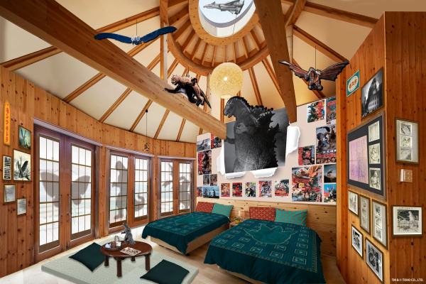 「ゴジラ」の70周年を記念し、歴代の「ゴジラ」映画作品に登場した怪獣たちが大集合したゴジラコラボルーム『怪獣ランド』。室内には、歴代ゴジラと人気怪獣たちが描かれたインテリアやタペストリー、窓越しに見える実寸大ゴジラの一部、さらに、それらに光の照射で見え方が変わる特殊加工を施すことによって、昼・夜で異なった室内の雰囲気をお楽しみいただけます。室内に隠れた全ての怪獣たちを見つけ出すことで豪華特典が手に入る“特別任務”に挑戦していただくなど、昼夜通してお愉しみいただけるお部屋です。