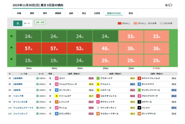 当日のレース結果をリアルタイムで反映し、3着以内に入線した馬の枠番、脚質、騎手、通過位置などの情報を一覧表示。当日のレース傾向を一目で把握できます。