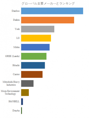 主要プレイヤーは、LP Information(2025年)によると米国、欧州、日本、韓国の大手電機・重工メーカーが中心となる。技術的には圧縮機単体性能の競争から、熱交換器・インバータ・制御ソフトを含むシステムインテグレーション能力が差別化の焦点へと移り、特定用途向けカスタマイズ性とサービス力を兼ね備える企業が存在感を高めている。この傾向は日系・欧州系の高信頼性ブランドが依然として高シェアを維持しつつも、アジア勢によるコスト競争力を活かした追撃が激化しているという構図を形成しており、市場シェアの再編可能性も高まる。