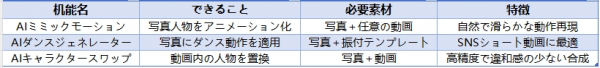 今回追加された「AIミミックモーション」「AIダンスジェネレーター」「AIキャラクタースワップ」は、いずれも1枚の写真と1本の動画を用意するだけで人物の動作生成や置換を自動で行い、初心者でもプロレベルのアニメーション動画を作成できる画期的な新機能です。