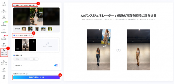 2.AIダンスジェネレーター:人気のダンスモーションを瞬時に適用:多数のトレンド振付テンプレートを搭載。写真の人物がSNSで話題のダンスを踊るショート動画を、数秒で生成できます。
