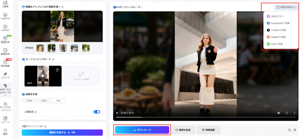 プレビューで映像・音声(ナレーション/BGM/効果音など)を確認。必要なら再生成や修正が可能。満足したら動画をダウンロード/エクスポート。SNS、YouTube、広告、プレゼン、教育コンテンツなどに利用できます。