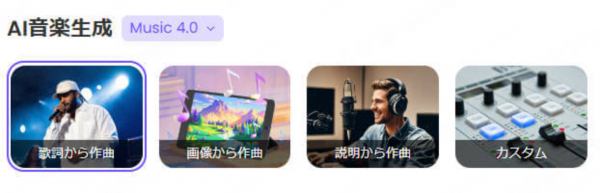 ユーザーは「歌詞から作曲」「画像から作曲」「説明から作曲」のいずれかを利用して音楽生成を開始可能。これにより、作曲経験がなくても、直感的に音楽制作がスタートできます。