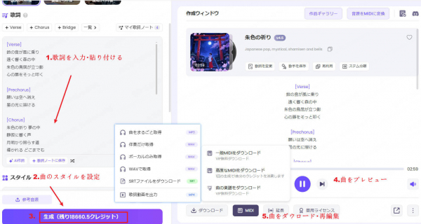 ステップ 5:生成された楽曲をダウンロード、MIDI/楽譜としてエクスポート可(必要に応じて編集)