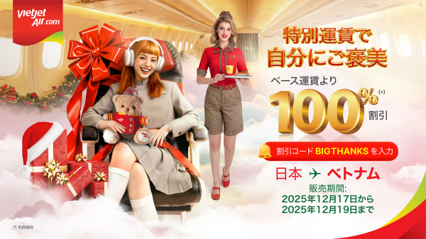 (東京, 2025年12月16日) - ベトジェットは、日本人旅行者の皆様が一年の締めくくりに自分へのご褒美としてベトナム、そしてその先への海外旅行を楽しめるよう、12月17日から3日間限定で、数百万枚の航空券を最大100%割引するチケットプロモーションを実施します。旅行者の皆様は、日本とベトナム間で運航している10の直行便をはじめとするベトジェットの国内外路線を対象とした本チケットプロモーションをご利用いただくことで、2026年のご旅行をよりお得に計画することができます。