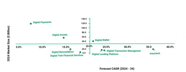 ● デジタル決済とデジタル資産は市場規模が最大であるが、既に確立されているため成長率は比較的穏やかである。