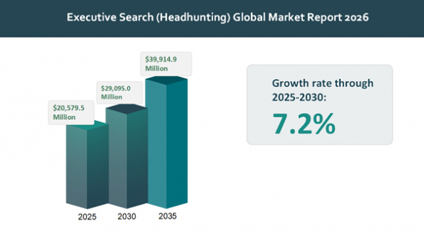 二〇二五年における世界のエグゼクティブサーチ(ヘッドハンティング)市場規模は約二〇・五七九五十億米ドルに達し、二〇二〇年以降、年平均成長率(CAGR)四・一%で成長しました。同市場は、二〇二五年の二〇・五七九五十億米ドルから二〇三〇年には二九・〇九五〇十億米ドルへ拡大し、この期間の年平均成長率は七・二%と見込まれています。さらに二〇三〇年以降も成長は継続し、年平均成長率三・二%で推移し、二〇三五年には市場規模が約三九・九一四九十億米ドルに達すると予測されています。