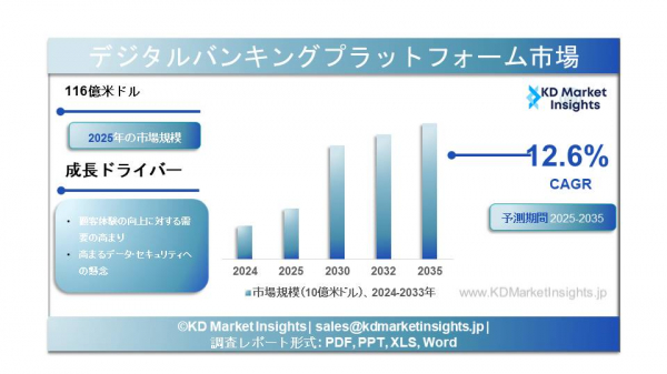 デジタルバンキング・プラットフォームの世界市場に関する 調査報告書によると、同市場は2025年から2035年にかけて年平均成長率12.6%を予測し、2035年末までに268億米ド ルの市場規模を創出すると予測されています。2025年の市場規模は116億米ドルでした。