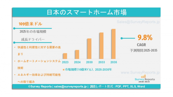 Surveyreportsの専門家は日本スマートホーム市場に関する調査を分析し、同市場規模は2025年に109億米ドルを創出したと明らかにした。さらに、日本スマートホーム市場は2035年末までに売上高が259億米ドルに達すると予測されている。同市場は、2025年から2035年の予測期間において、約9.8%の年平均成長率(CAGR)で成長すると見込まれているのである。