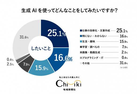 「生成AIを使ってどんなことをしてみたいですか?」という質問に対して、回答の1位は「仕事の効率化・文章作成」で25.1%でした。しかし、まだまだ生成AIは発展途上で、仕事で利用する際のルールや仕組み作りが整っているとは言い難い状況にあります。それは回答の2位が「特にない・わからない」であることからもうかがえます。3位以降は、趣味や調べもの、画像や動画生成と続き、わずかながらプログラミングやITという回答もありました。