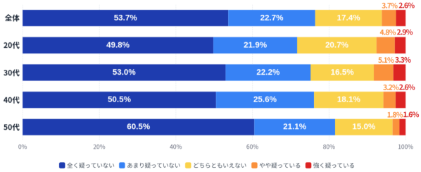 また、「やや疑っている」「強く疑っている」を合わせた割合は、20代で7.7%、30代で8.4%、40代で5.8%、50代で3.4%となっており、年齢が上がるにつれて疑念を抱く人が少なくなる傾向が見られます。