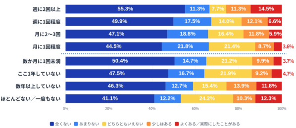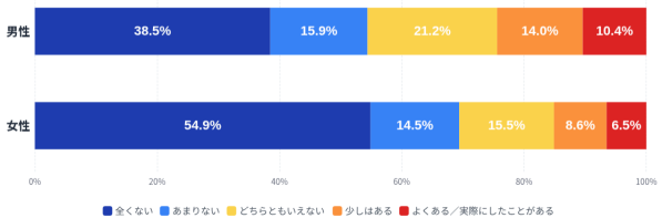 一方で、「少しはある」「よくある/実際にしたことがある」を合わせた肯定側の割合は、男性が24.4%、女性が15.1%と、男性の方が約9ポイント高くなっています。