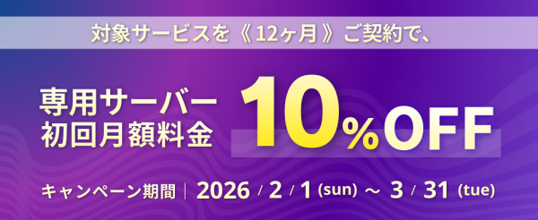 Winserver(ウィンサーバー/運営会社:アシストアップ株式会社、所在地:大阪府大阪市、代表取締役:青木 勝彦)は、2026年2月1日(日)~3月31日(火)の期間、専用サーバー初回月額料金10%OFFキャンペーンを実施いたします。