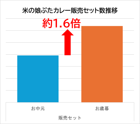 「米の娘ぶたカレー」は新パッケージでの販売を2025年度のお歳暮カタログにて始めたところ、準備数量がわずか1週間で完売。同年のお中元期よりセット販売数は1.6倍に増加し、地元で贈り物として大変好評を得ております。