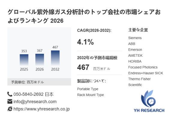 YH Researchによるとのグローバル紫外線ガス分析計の市場は2025年の353百万米ドルから2032年には467百万米ドルに成長し、2026年から2032年の間にCAGRは4.1%になると予測されている。