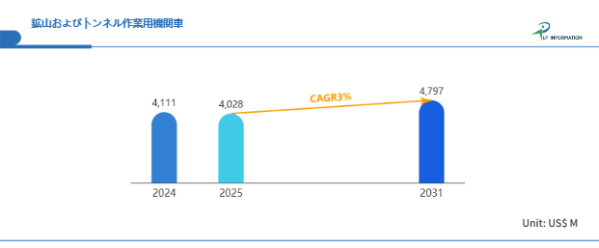 LP Information調査チームの最新レポートである「世界鉱山およびトンネル作業用機関車市場の成長予測2025~2031」(https://www.lpinformation.jp/reports/565100/rolling-stock-for-mining-and-tunnelling)によると、2025年から2031年の予測期間中のCAGRが3%で、2031年までにグローバル鉱山およびトンネル作業用機関車市場規模は47.97億米ドルに達すると予測されている。