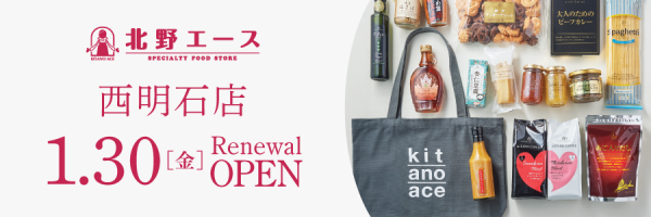 リニューアルオープンを記念して、お得なイベントも開催。リニューアルオープン当日の1月30日(金)限定で、税込1,080円以上お買い上げのお客様は10%OFF、また1月31日(土)・2月1日(日)に税込3,240円ご購入のお客様に玉子(10個入り)をプレゼントいたします。また、人気商品を通常よりもお買い得価格でご用意するほか、北野エースのプライベートブランド「キタノセレクション」の特別価格販売も行います。