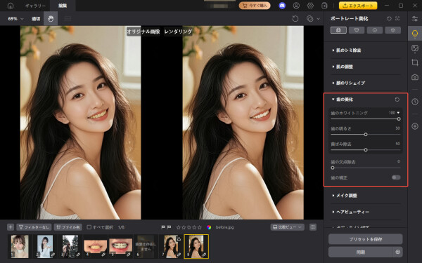 ・歯の補正に加え、写真全体の明るさや色調もまとめて調整可能