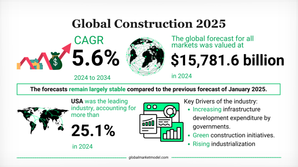 二〇二五年七月版グローバル・マーケット・モデルの予測は、世界の建設産業が安定的かつ持続的に拡大していることを示しています。この成長は、大規模なインフラ計画、グリーン建設手法の採用加速、そして継続的な都市開発によって支えられています。